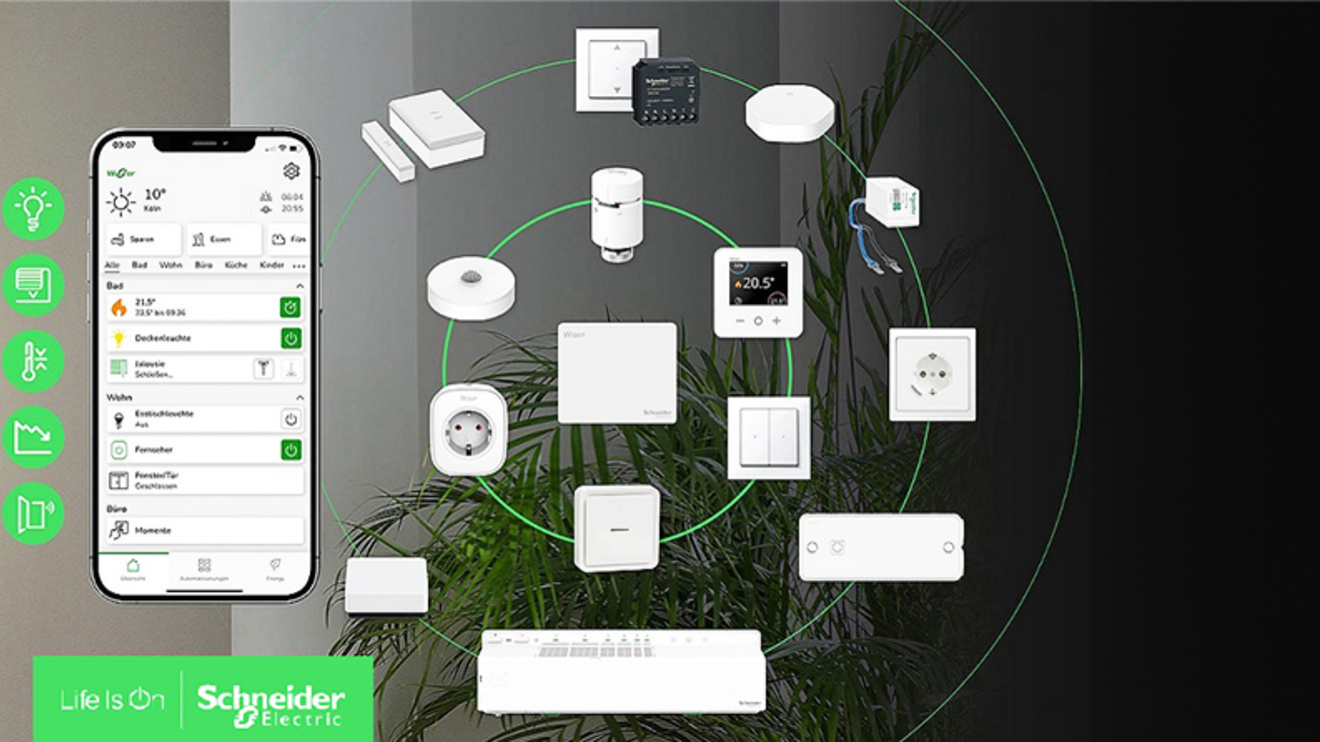 Mit Wiser Home steuert man komfortabel und effizient Heizung, Licht, und Jalousie, überwacht und optimiert den Energieverbrauch und nutzt die intelligenten Wiser Sensoren. Wiser lässt sich intuitiv von Zuhause per Schalter, per Sprache mit Google Home™ oder Amazon Alexa™, oder mit der neuen Wiser Home App – auch von unterwegs – steuern.