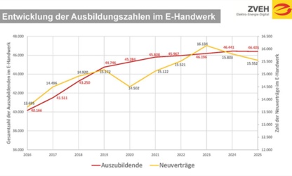 Bereits 2024 ging die Zahl der Neuverträge leicht zurück. Dieser Trend setzt sich 2025 fort. Bei der Gesamtzahl der Auszubildenden verzeichnen die E-Handwerke ebenfalls – und erstmals seit 2014 – ...