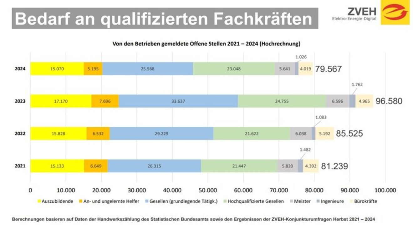 96.000 e-handwerkliche Fachkräfte gesucht, sind es nun nur noch knapp 80.000**. Das entspricht etwa dem Niveau von 2021 und zeigt: Die Betriebe sind zurückhaltender bei der Ausschreibung und Besetzung von Stellen. Grund dafür sind unter anderem Rückgänge bei den Auftragsvolumina. Gleichzeitig ist davon auszugehen, dass auch die Fluktuation unter den