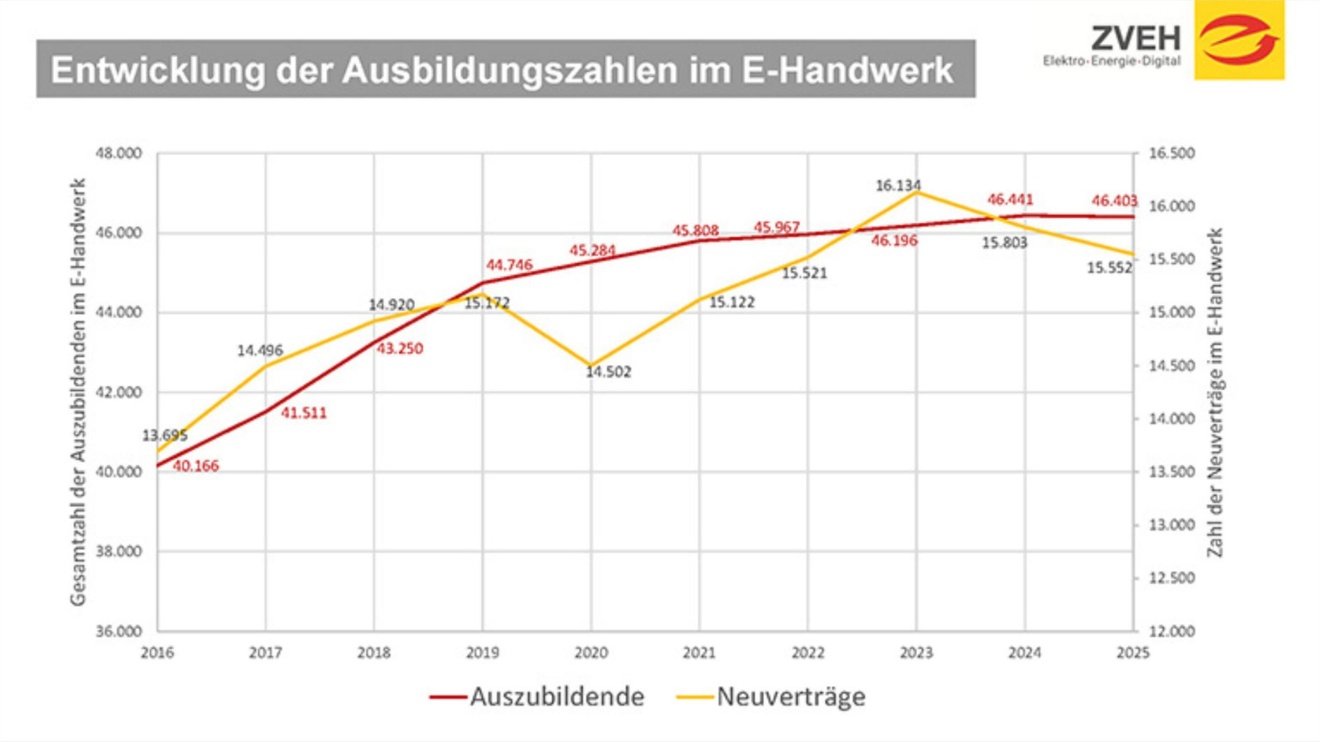 Die Zahl der Auszubildenden in den E-Handwerken ging im vergangenen Jahr nach jahrelangem kontinuierlichem Wachstum erstmals von 46.481 in 2024 auf 46.403 in 2025 zurück. Mit 0,2 Prozent fiel der Rückgang jedoch sehr gering aus. Der Rückgang verteilt sich nicht gleichmäßig auf die fünf e-handwerklichen Berufe. So sind die Rückgänge im Bereich "Informationselektroniker/-in" (–1,9 Prozent) und "Elektroniker/-in Fachrichtung Automatisierungs- und Systemtechnik" (–2,0 Prozent) überdurchschnittlich hoch. Im Beruf "Elektroniker/-in Fachrichtung Energie- und Gebäudetechnik" (EEGT), der den Löwenanteil der Auszubildenden stellt, sank die Zahl hingegen nur unwesentlich, von 41.397 auf 41.379.