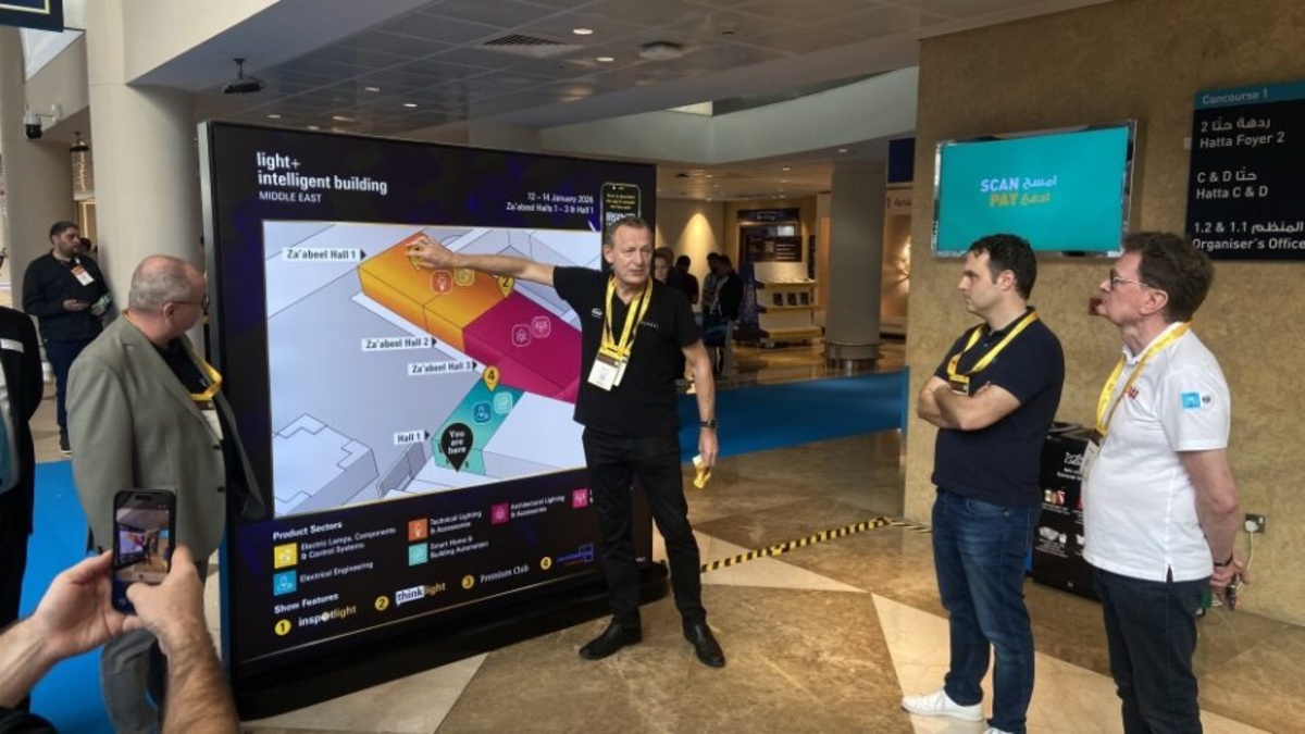 Den fachlichen Auftakt bildete der Besuch der Fachmesse Light + Intelligent Building Middle East. Johannes Möller, Group Show Director, Building Technologies Shows bei der Messe Frankfurt Exhibition GmbH, und Heinz Lux, CEO der KNX Association, führten die Teilnehmer über die Messe und gaben einen konzentrierten Überblick über technologische Trends und Lösungen für vernetzte Gebäude. In der Premium Lounge bot sich anschließend Raum für Gespräche über internationale Projektanforderungen und regionale Besonderheiten.