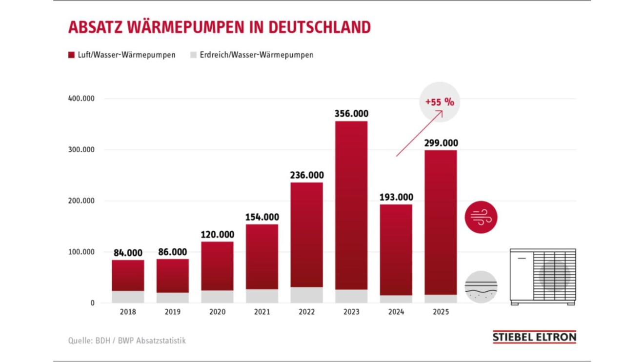 Die Zahl der in Deutschland verkauften Wärmepumpenheizungen erreichte 2025 das zweitbeste Ergebnis aller Zeiten: Innerhalb von fünf Jahren hat sich der Absatz mehr als verdoppelt. Dreh- und Angelpunkt für die Energiewende ist Vertrauen in die politischen Rahmenbedingungen: 89 Prozent der Verbraucher halten Planungssicherheit bei der staatlichen Förderung zum Heizungstauch für wichtig bis sehr wichtig. Das hat die bevölkerungsrepräsentative Umfrage zum Energie-Trendmonitor 2026 ergeben – 1.000 Bundesbürgerinnen und Bundesbürger wurden im Januar 2026 von einem Marktforschungsinstitut im Auftrag von Stiebel Eltron befragt.